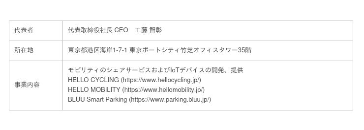 自転車活用推進法の後押しやユニークな水平分業型の地域パートナーモデルにより国内最大級のシェアサイクルプラットフォームである「HELLO CYCLING」を運営するほか、シェアモビリティサービス「HELLO MOBILITY」、パーキングシェアサービス「BLUU Smart Parking」の展開などを通じてラストワンマイルにおける多様な移動手段を提供しています。