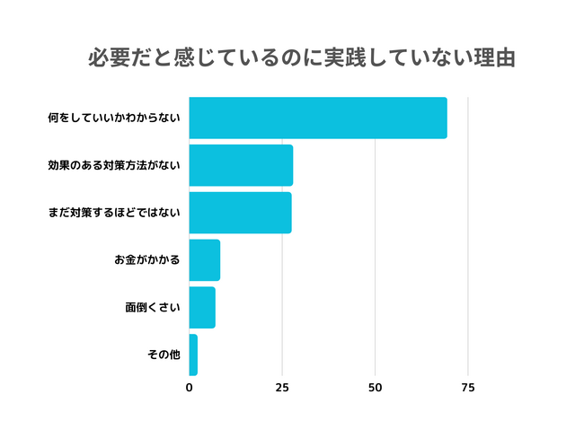 何をしていいかわからない(69.4%)、効果のある対策方法がない(27.9%)、まだ対策するほどではない(27.5%)などが多く見られました。