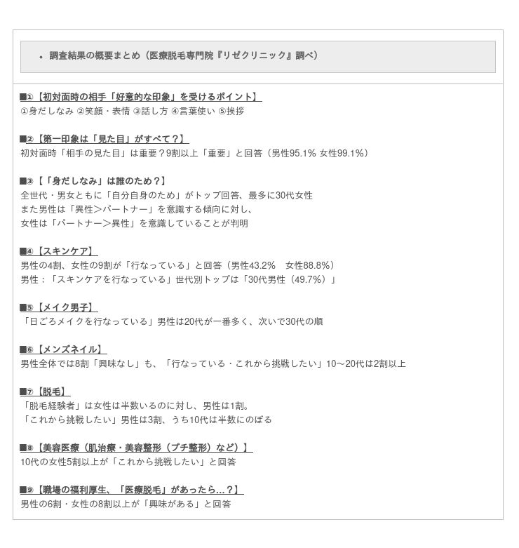 ※ 清潔感・身だしなみの向上・自信向上の一環として、医療脱毛専門院の「リゼクリニック(男性はメンズリゼ)」では、福利厚生での「医療脱毛」導入のご相談も一部承っております。リリース文中下の連絡先までお気軽にお問い合わせください。