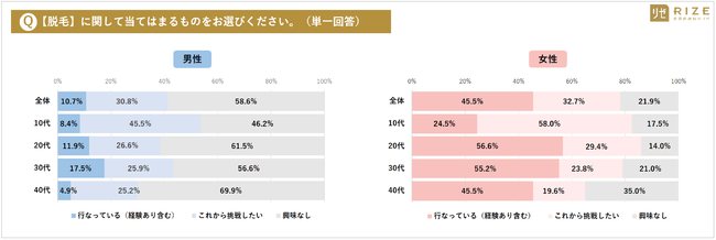 7.【脱毛】「経験者」は女性半数に対し、男性は1割。「これから挑戦したい」男性は3割、うち10代は半数にのぼる
