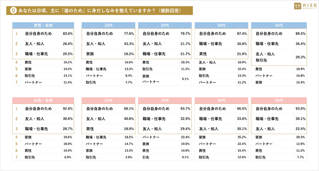 また、【身だしなみを整える理由】に、全世代・男女ともに「自分自身のため」が男性83.6%、女性92.8%で、2位の「友人・知人のため(男性26.0%、女性30.6%)」、3位の「職場・仕事先のため(男性25.5%、女性28.7%)」に大差をつけ、1位という結果に。
