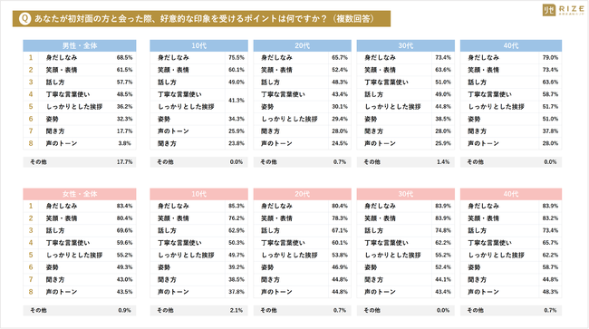 ◎【性別・世代問わず、共通する「第一印象時の重要ポイント」】1位「身だしなみ」、2位「笑顔・表情」