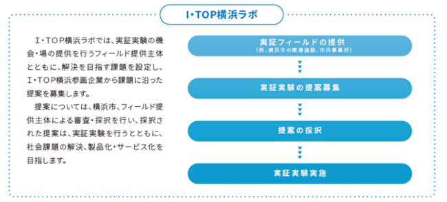 「I・TOP横浜ラボ」は、「I・TOP横浜」の取組の一つで、実証実験の機会やフィールドの提供主体とともに、解決を目指す課題を設定し、I・TOP横浜参画企業から課題に沿った提案の募集等を行い、実証実験を通じて、社会課題の解決や製品化・サービス化を目指します。