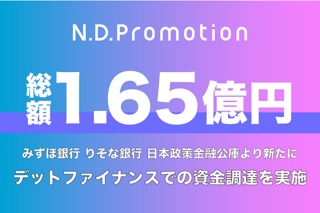 Z世代を対象とするシンクタンク組織「Z総研」の運営やインフルエンサーマーケティング事業を行う株式会社N.D.Promotion (本社 : 東京都渋谷区、代表取締役社長:金丸雄一、以下N.D.Promotion )は、事業の急速な拡大にともなう運転資金確保として、国内大手銀行(みずほ銀行、りそな銀行、日本政策金融公庫)などから1.65億円の融資枠を確保し、デットファイナンスによる資金調達を実施したことをお知らせします。