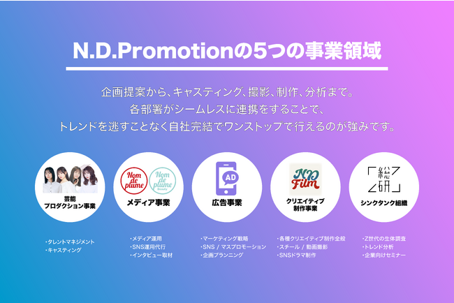 N.D.Promotionは、1990年代後半から2000年生まれのZ世代と呼ばれる女の子を中心にトレンドを研究・創出・拡散する「TREND CREATIVE AGENCY」であり、トレンドに最も敏感で貪欲なZ世代を中心に「今1番気になる」ひと・もの・ことをデジタルとリアルの垣根なく、創造・発信するプロクリエイター集団です。N.D.Promotionは、芸能プロダクション事業、メディア事業、広告代理事業、D2C事業などをはじめ、Z世代に向けたコンテンツを発信しています。