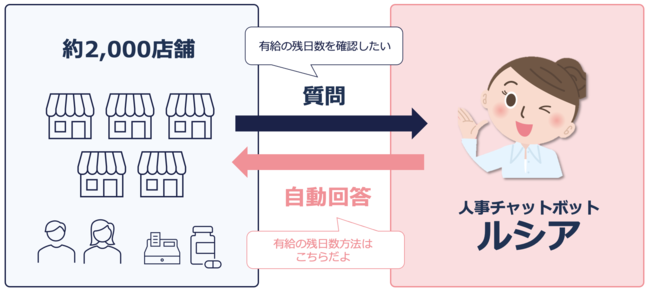ウエルシア薬局様では現在、「ルシア」というチャットボットを社内に配属し、約2,000店舗で働く、店長、薬剤師、パート、アルバイトなど多くの従業員様の疑問解決にご利用いただいています。会社情報・CSR・家族情報の変更・慶弔・安全衛生管理・福利厚生、産休・育休・財形貯蓄・持株会・企業年金・社内規程・経費精算・設備管理・車両管理・物品管理・身上異動・人事評価・財形貯蓄・社宅・給与など、人事・労務を中心に幅広い質問に「ルシア」が回答します。「ルシア」の月間利用数は5,000件を超え、回答精度は90%以上と、公開直後から従業員様の疑問解決にお役立ていただいております。