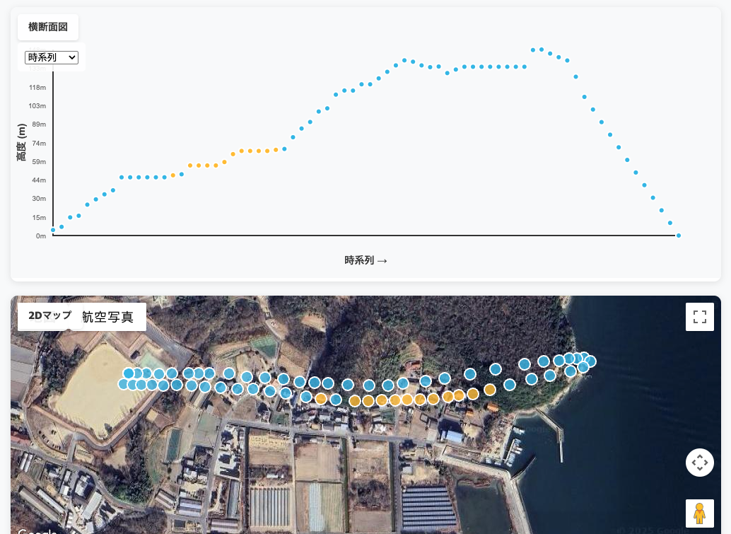 統合マップ:2D図と横断面図を同時表示させることで飛行ルート全体を視覚的に把握