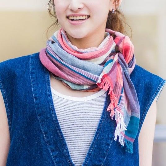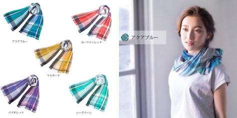 多色使いで織りあげたガーゼマフラー。強い日差しから肌をしっかりとカバーし汗を瞬間吸収。汗ばむ時期でも快適。