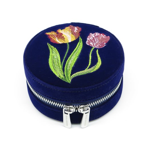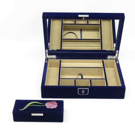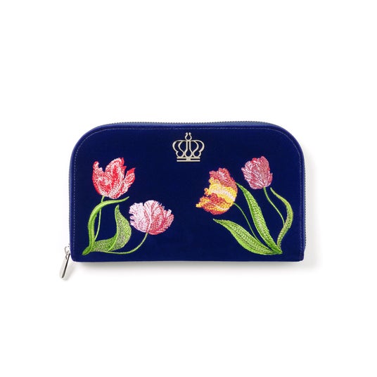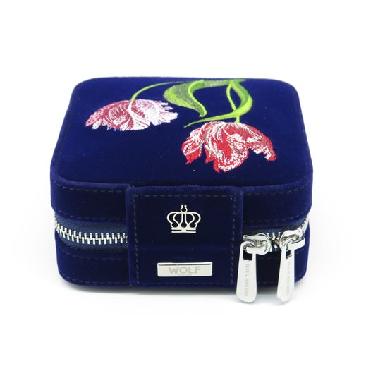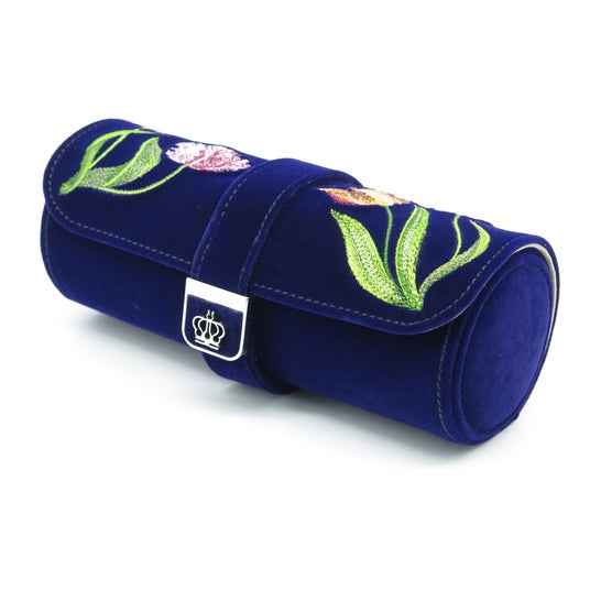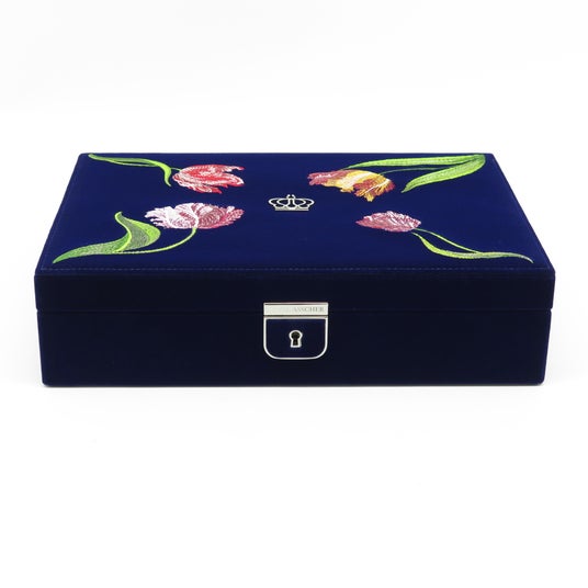 「WOLF X ROYAL ASSCHER COLLECTION」は、ラスターロック(TM)加工(WOLF社独自の技術で、ジュエリーの変色を防ぐことができます)が施されており、ロイヤル・アッシャーのダイヤモンドジュエリーや大切な宝物を完璧に保管することができます。ロイヤル・アッシャーのブランドカラーであるブルーの豪華なベルベットに、ロイヤル・アッシャー創業の地であるオランダの伝統を象徴するチューリップの刺繍が施されています。チューリップの花には17,000以上のステッチが施され、最も美しいテクスチャー効果を生み出しています。ケースとジッパーの引き手にはロイヤル・アッシャーのロゴがあしらわれ、すべての製品はロイヤル・アッシャーブルーのボックスに収められています。