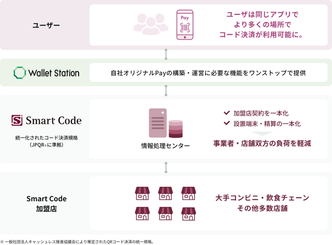 「Smart Code」対応により「Wallet Station」を活用したオリジナルPay導入企業は加盟店ごとに個別契約を結ぶことなく(※1)、オリジナルPayを全国の「Smart Code」加盟店に展開することができます。これにより全国の大手コンビニ、飲食チェーン、その他多数の店舗(※2)でオリジナルPayが利用可能になります。