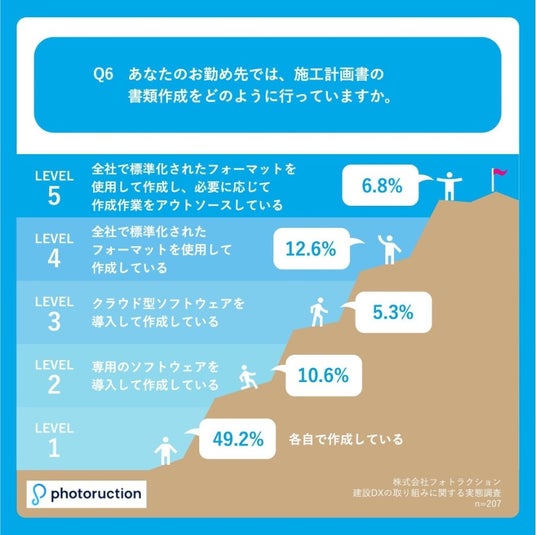 「Q6.あなたのお勤め先では、施工計画書の書類作成をどのように行っていますか。」(n=207)と質問したところ、「レベル1:各自が作成している」が49.2%、「レベル4:全社で標準化されたフォーマットを使用して作成している」が12.6%という回答となりました。