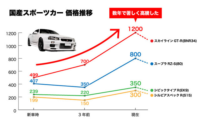 旧車はここ数年で価格の高騰が著しく、新車価格の2倍、3倍まで価格が上がったものもありプレミア価格がついているものもしばしば見受けられます。