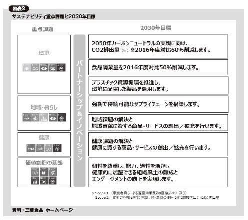 三菱食品では、一般には伝わりにくい「食品卸売業」という業態の果たす社会的機能や役割、更には知的資産をステークホルダーに周知するため、昨年度より統合報告書を発行しています。本稿では「三菱食品 統合報告書2023」を基に、当グループが設定する4つの「サステナビリティ重点課題」のうち、環境問題対応の「2030年目標」として挙げられる[1]CO2排出量削減、[2]TCFD、[3]Scope 3に焦点を当て、主に脱炭素への取り組み事例を紹介します。