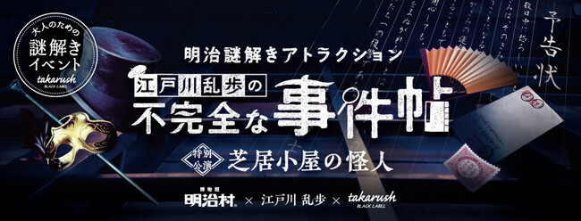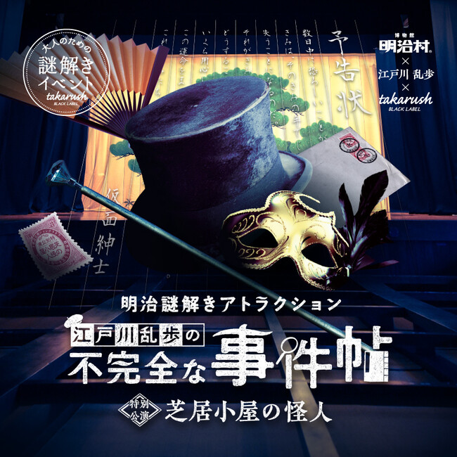 体験型コンテンツ「リアル宝探し」の企画・制作・運営を手がける株式会社タカラッシュ(本社:東京都品川区、代表取締役:齊藤 多可志、以下タカラッシュ)は、博物館明治村(愛知県犬山市字内山)を舞台とする大人に向けた謎解きアトラクション 「江戸川乱歩の不完全な事件帖~芝居小屋の怪人~」を12月24日(土)より開催することを発表いたしました。