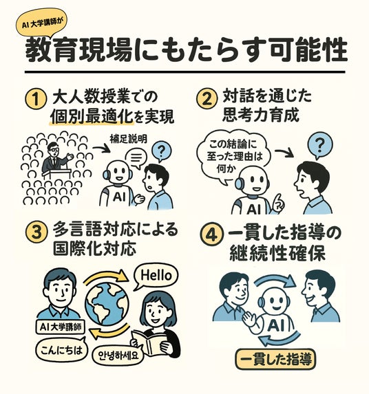 株式会社DOU(本社:東京都、代表取締役:石部達也)はこのほど、日本国内初となる「AI大学講師」サービスの提供を開始いたしました。このAI大学講師は弊社が提供する「キャリアパスポート」の技術を活用したもので、大規模言語モデルChatGPTと受講生ひとりひとりの学習履歴データベースを掛け合わせることで、従来の教育現場では実現困難だった「思考プロセスの可視化」と「個別最適化された対話型指導」を可能にするものです。日本の大学教育において、AIが講師として正式に導入されるのは今回が初の試みです(*1)。今後、前期授業期間が終了する7月までの期間で実証実験を行い、教育効果の定量的検証に取り組んで参ります。