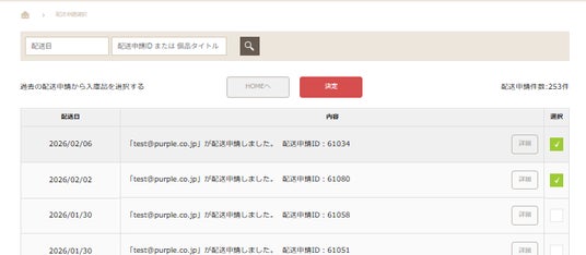 - 過去の配送申請一覧から選択可能入庫申請時に「出庫した物品を再入庫」を選択すると、過去の申請履歴が表示されます。その中から戻したい荷物を含む申請を選ぶだけで、情報の呼び出しが可能です。