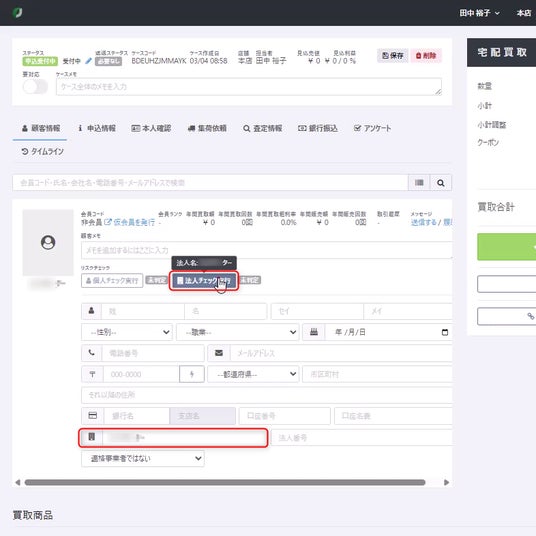 買取店の担当者がエンドユーザー(個人・法人)から個人情報を取得し登録・本人確認を行うプロセスにおいて、RiskAnalyzeのデータベースを用いたリスクチェックを実行できます 。RECOREのUI上に注意喚起のアラートが直接表示されるため、本人確認からリスクチェックまでを別ツールを立ち上げることなくシームレスに完結でき、入力ミスや手間を防止します 。