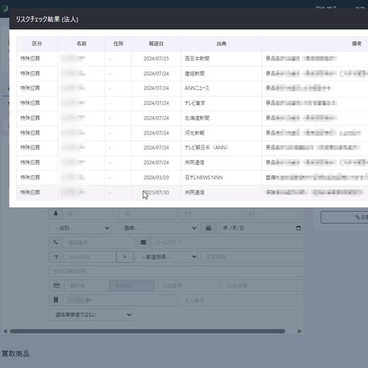 - リユース・買取業務における重大リスクの徹底検知主に高額商材の買取実務において、店舗運営や企業コンプライアンスの致命的な脅威となり得る「暴力団」「密接交際者」「準暴力団」「フロント企業」「過激派」「特殊犯罪(窃盗含む)」に関する情報を網羅的に検出します。リユース業界の特性に合わせ、取引判断に直結する重要情報を徹底的に洗い出すことで、不正品の流入や反社会的勢力との接触を未然に防ぎ、安全な取引環境を強固に守ります。