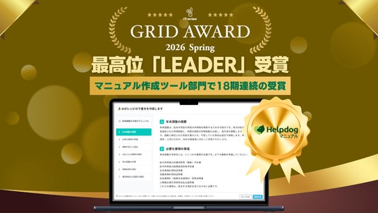 noco株式会社(本社:東京都中央区、代表取締役:堀辺 憲)が提供するAIマニュアル作成ツール「ヘルプドッグマニュアル」(https://toaster.how/)は、アイティクラウド株式会社が主催する「ITreview Grid Award 2026 Spring」において、マニュアル作成ツール部門の最高位である「Leader」を受賞したことをお知らせいたします。同部門での受賞は18期連続となります。