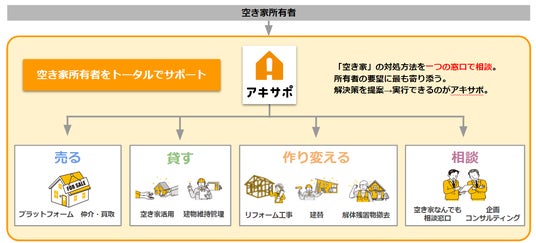 企画コンサルティング、建物管理、売却、解体、建替など、活用に適さない空き家についてもトータルでサポートいたします。空き家のあらゆる課題を解決するために、空き家事業の一環として展開しております。