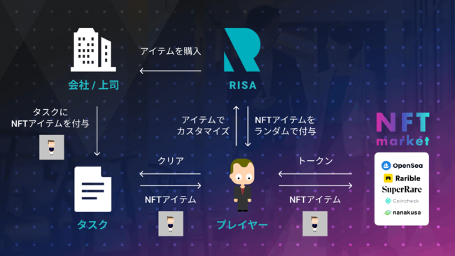 そのコアは仕事を頑張るとその分NFTがもらえて、そのNFTを使ってRISAをカスタマイズしたり、マーケットプレイスで売ることができるというインセンティブ構造の変革です。