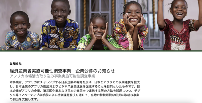 (日)「アフリカ市場活力取り込み事業実施可能性調査事業」は、アフリカにチャレンジする日系企業の裾野を広げ、日本とアフリカの民間連携を拡大し、日本企業のアフリカ進出およびビジネス展開進展を促進することを目的とし、経済産業省が実施する事業です。当事業を通じて、日本企業がアフリカ企業、第三国企業および日本企業同士で連携する等の方法を活用しつつ、デジタル等イノベーティブな手段による社会課題解決を通じて、当地の持続可能な成長に取組む事業の創出を支援します。当事業を行う背景・目的として、アフリカは人口増による高い潜在力を抱えるフロンティアですが、日本企業進出の現状を見ると、さらなる市場開拓余地は大きく、日本企業による新興国市場の開拓において、中長期的な戦略や各国・地域の成長度合いを考えると、既に日本企業の進出が相当程度進んでいるASEAN主要国の次の新興国市場である、アフリカ諸国にも目を向け、開拓の足がかりを作っていく必要があります。また、アフリカへの市場進出を拡大させるには、現地のニーズを的確に捉え、社会課題解決を通じたビジネス展開するための環境を整えることが重要です。このため、日本企業がアフリカ企業、第3国企業及び日本企業同士で連携する等の方法を活用しつつ、デジタル等イノベーティブな手段による社会課題解決を通じて、当地の持続可能な成長に取組む事業の創出を支援することで、アフリカにチャレンジする日系企業の裾野を広げ、日本・アフリカの民間連携を拡大し、日本企業のアフリカ進出及びビジネス展開進展を促進します。