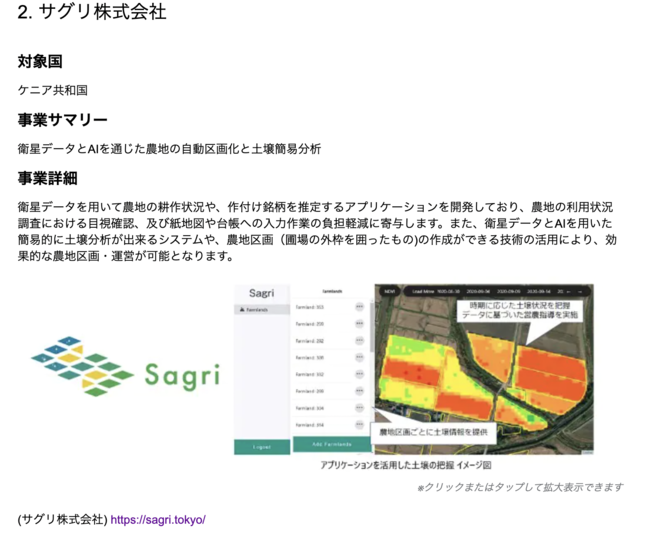 (日)弊社代表の坪井は、2016年ルワンダに赴き、1ヶ月に渡り、教育活動を行う中で、現地の子どもが各々夢を持ちつつも、卒業後、家計を支えるために農業現場で働くことを知りました。この状況を打破するため、衛星データを使うことで、世界中の1筆ごとの農地で起きている状況を可視化することができ、農地状況ごとに最適な指導をできることによって、農家の所得向上につながり、農業世帯の家庭環境も改善されると考え、サグリを創業しました。将来的に、次世代の農業世帯の子どもが農業を一つの選択肢として捉え、自分の夢へ挑戦できる環境づくりを目指しています。本事業を通じて、創業のきっかけとなったアフリカにおいて事業展開を開始します。