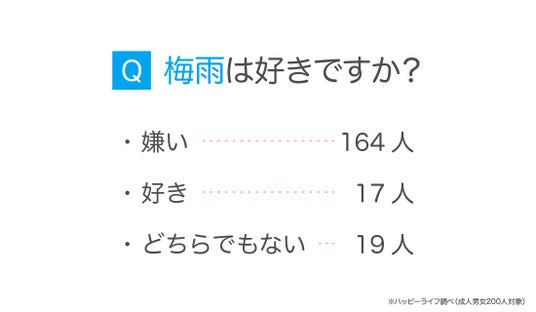 ハッピーライフでは、成人男女200人に「梅雨は好きですか?」というアンケートを取りました。