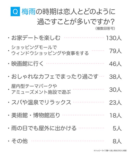 ハッピーライフでは、成人男女200人に「梅雨の時期は恋人とどのように過ごすことが多いですか?」というアンケートを取りました。