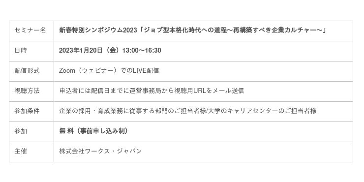 株式会社ワークス・ジャパン(本社:東京都千代田区、代表取締役:清水信一郎、以下 ワークス・ジャパン)は、2023年1月20日(金)に採用業務に従事する部門のご担当者様、企業の採用・育成業務に従事する部門のご担当者様と大学のキャリアセンターのご担当者様を対象にしたオンラインセミナー「新春特別シンポジウム2023 ジョブ型本格化時代への道程 ~再構築すべき企業カルチャー~」を開催します。