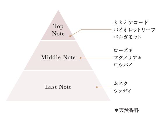 ラストにはムスクやウッディが溶け合いながら香り立ち、しっとりとした色香と深い愛情で包み込んでゆく。
