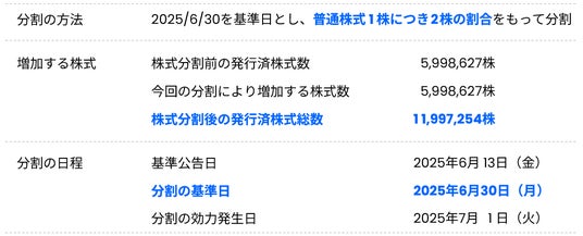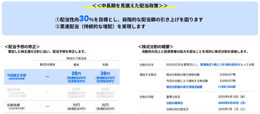 今回の配当政策の変更と併せて、東京証券取引所が示す「株価水準に応じた株式分割の活用に関する考え方」に基づき、当社株式の投資単位の負担感を軽減し、流動性の向上および投資家層の拡大を目的として株式分割を実施することも決定いたしました。