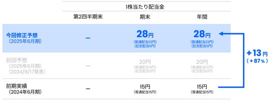 配当政策の変更に基づき、2025年6月期の配当予想を以下のとおり修正いたします。これは、当社株式の市場価格の動向、財務状況、今後の事業展開等を総合的に勘案した上で、株主の皆様への一層の利益還元を図るとともに、企業価値の向上を目的として実施するものであります。