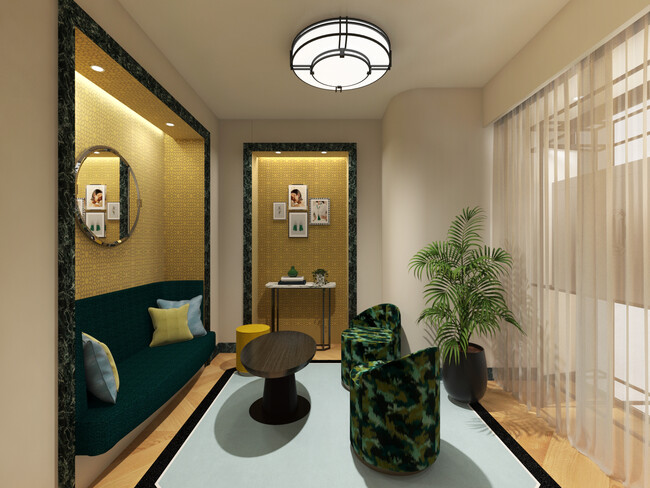 また、ブティックにはメゾンの歴史と文化、そして創造的で革新的なブシュロンのエスプリを堪能できるVIPサロンを設置。ブシュロンが創業当時よりクリエイションのテーマとしてきたナチュール(自然)をコンセプトとしたサロンには、庭園を彷彿させるボタニカルモチーフがあしらわれ、モダンでリラックスムード漂う雰囲気が特徴です。また、色彩豊かなファブリックやウォールペーパーを採用し、ブシュロンのアーカイブジュエリーのビジュアルがディスプレイされます。
