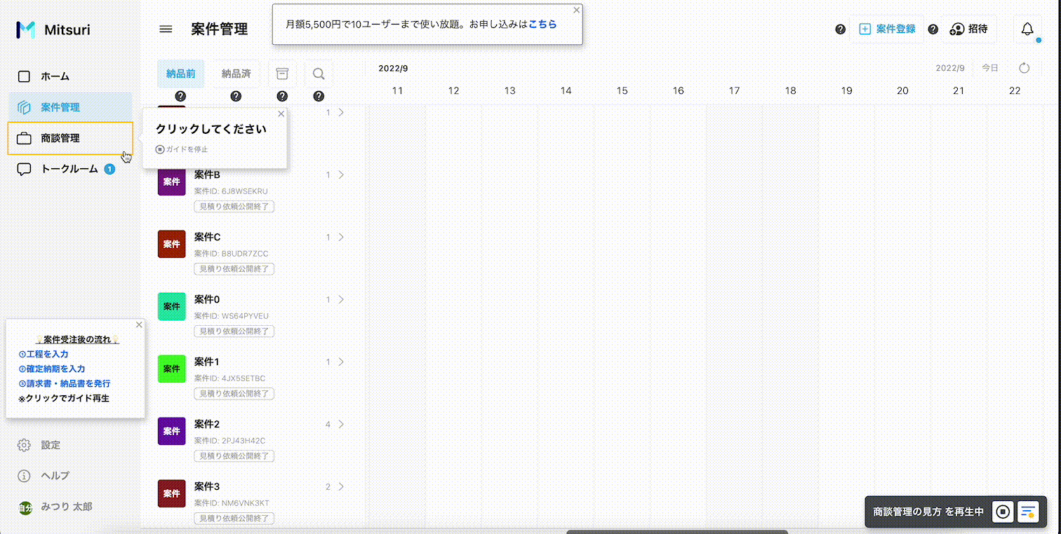 テックタッチを通じて、ユーザーが「Mitsuri」をより活用できそうだと感じたことが決め手でした。操作手順を自動再生したり、登録して最初にやるべきタスクリストを表示したりすることで、ユーザーのスムーズな操作や、従来では扱いきれなかった機能の活用を支援することで、必要な時に必要なオンボーディングを提供でき、ユーザーが「Mitsuri」を有効活用することを促せると感じました。