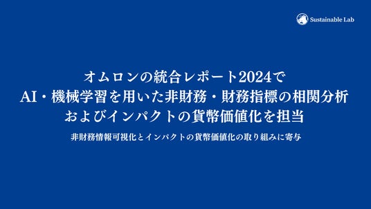 国内最大級の非財務データプラットフォーム「TERRAST(テラスト)」や財務・非財務データ分析支援を提供するサステナブル・ラボ株式会社(本社:東京都千代田区、代表取締役:平瀬錬司、以下「当社」)は、オムロン株式会社(本社:京都府京都市、代表取締役社長CEO:辻永 順太、以下「オムロン」)が発表した統合レポート2024において、AI・機械学習によるモデル分析を用いた非財務指標と財務指標の相関分析およびインパクトの貨幣価値化を担当いたしました。