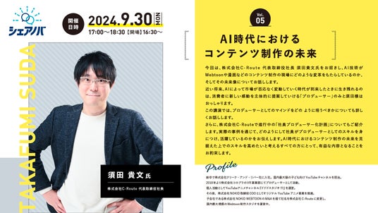 企業のマーケティング課題を、デジタルクリエイティブで解決する株式会社アクアスター(所在地:東京都中央区、代表取締役社長:原田 弘良、以下 当社)は、2024年9月30日(月)17時より社内勉強会「シェアノバ Vol.44」を開催します。今回の勉強会では、株式会社C-Route 代表取締役社長 須田貴文氏を迎えし、「AI時代におけるコンテンツ制作の未来」をテーマにお話しいただきます。