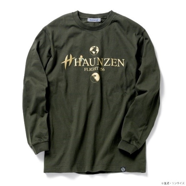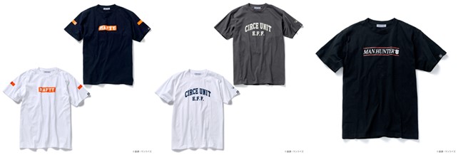 ハサウェイ、マフティー内Tシャツからイメージした「マフティーBOXロゴ柄」、地球連邦軍のキルケー部隊のロゴをアーミーカジュアル風にアレンジした「キルケ―部隊柄」、地球への不法滞在者摘発を行う組織、マンハンターのロゴをモチーフにした「マンハンター柄」Tシャツ3種。