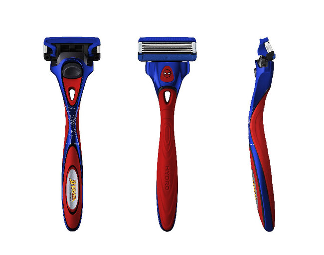 ・カミソリ本体のカラーリングは青と赤をベースにして、スパイダーマンのスーツを再現。