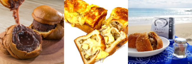 左から、スイートオーケストラ「白石あんぱん」、伊豆高原 フロマージュパン専門店Marble Coco.「大人のクワトロフロマージュ」、パンプラス「日本初壱岐牛カレーパン」