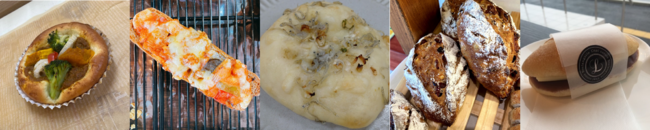 左から、ビッグママ おいしいパン屋さん「野菜ゴロゴロキーマカレーパン」、Mon Favori BAKERY「ブルスケッタ」、よつばBakery「しらすとネギの塩ピザ」、KOTINI BAKERY「フルーツカンパーニュ」、L'épi coloré「あんばたあ」