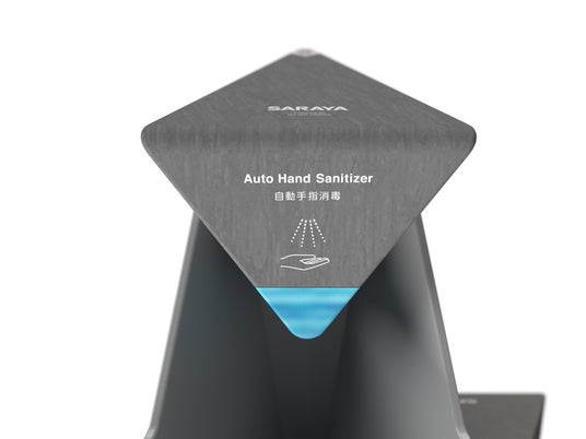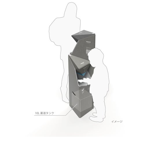 ユニバーサルデザインを考慮し、本体には日本語と英語の表記に加え、誰にでも理解しやすいピクトグラムを採用しました。また、大人だけでなく、背が低い子どもや車いすを利用される方々も使用しやすいように、手指を消毒するためのスペースは2種類の高さを用意しています。さらに手を入れるブースを大きくすることで使用時に消毒液が飛び散らないよう配慮しました。