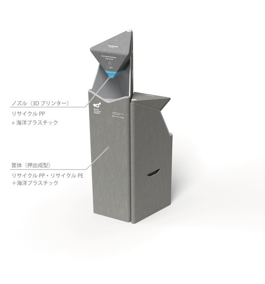 また、青いノズル部分には、再生PPに海洋プラスチックを配合した原料を使用し、3DPCの3Dプリンターで製造しています。