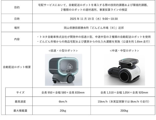 トヨタ・コニック・プロ株式会社(本社:東京都千代田区神田淡路町 2-101 ワテラスタワー、代表取締役社長:武田 淳一郎、以下「トヨタ・コニック・プロ」)は、経済産業省の「令和6年度補正予算 持続可能な物流を支える物流効率化実証事業」のうち『2.買物困難者対策事業:より配送能力の高い自動配送ロボットを活用した実証事業』に採択され、2025年11月19日(水) 9:00~10:30に岡山県の中山間地域において、2種類の自動配送ロボットを使用した公道走行実証実験を行います。