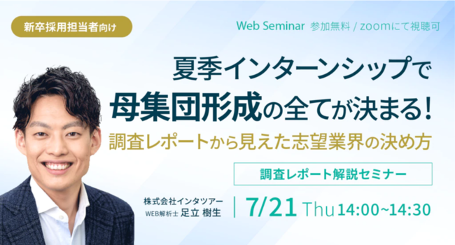新卒採用マーケティング・プラットフォームを提供する(株)インタツアー(代表:作馬 誠大、本社:東京都港区浜松町)は、2022年7月14日(木)に、新卒採用担当者向けオンラインセミナー『夏季インターンシップで『母集団形成』の全てが決まる!~調査レポートから見えた志望業界の決め方~』を開催いたします。
