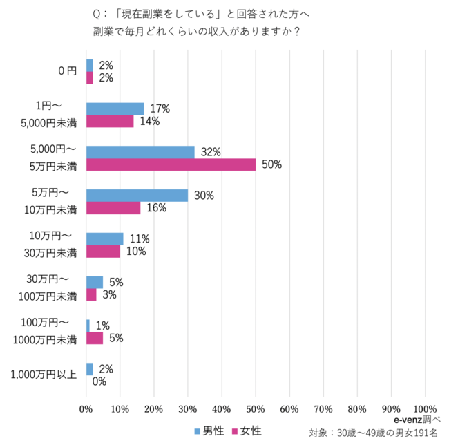 副業で1ケ月に稼いでいる金額で多かったのが、男性は「5,000円~5万円未満」「5万円~10万円未満」が約3割、女性は「5,000円~5万円未満」が半数を占めていました。