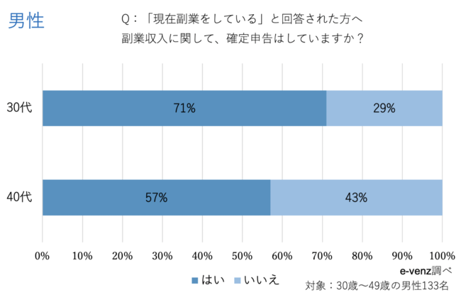 「確定申告をしている」と回答したのは、男性が30代71%・40代57%となっており、女性は30代66%・40代60%でした。