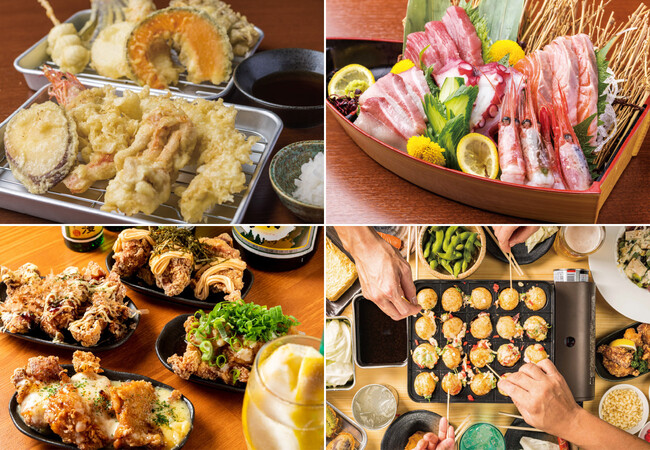 「串カツ」をはじめとして、「天ぷら」「大分中津のから揚げ」といった看板揚げ物を中心に取り揃えるほか、産地直送の海鮮メニューや手作り一品、グループさまに人気の「たこパセット」まで、様々な皆様に楽しんでいただける内容になっております。