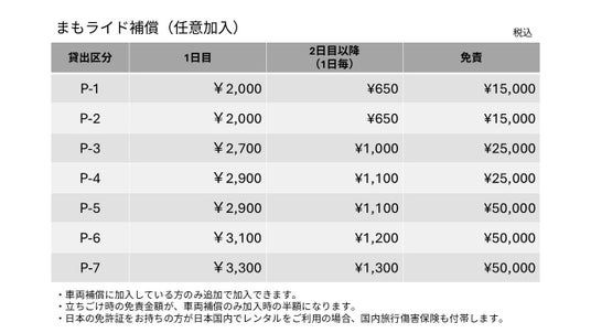 「まもライド補償」は任意加入のオプションサービスです。料金は車両クラスに応じて異なります。