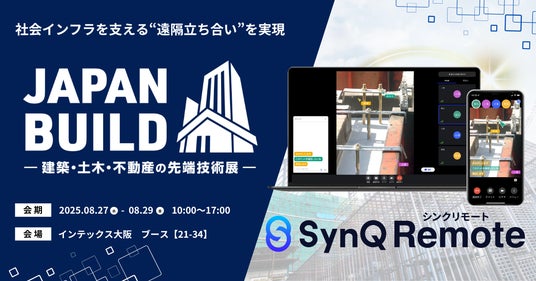 誰とでもつながれる。圧倒的に伝えられる。現場が求めたコミュニケーションツール「SynQ Remote(シンクリモート)」を開発提供する株式会社クアンド(本社:福岡県北九州市、代表取締役CEO:下岡 純一郎)は、2025年8月27日(水)~29日(金)にインテックス大阪で開催される「ジャパンビルド-建築の先端技術展-大阪 2025」に出展します。会場では、遠隔巡視の法整備がなされて1年で生まれた様々な建設業での遠隔化事例や、日経コンストラクション8月号でも特集された「東京水道株式会社(以下、東京水道)」の導入事例を通じて、社会インフラ現場における遠隔支援の最前線をご紹介します。